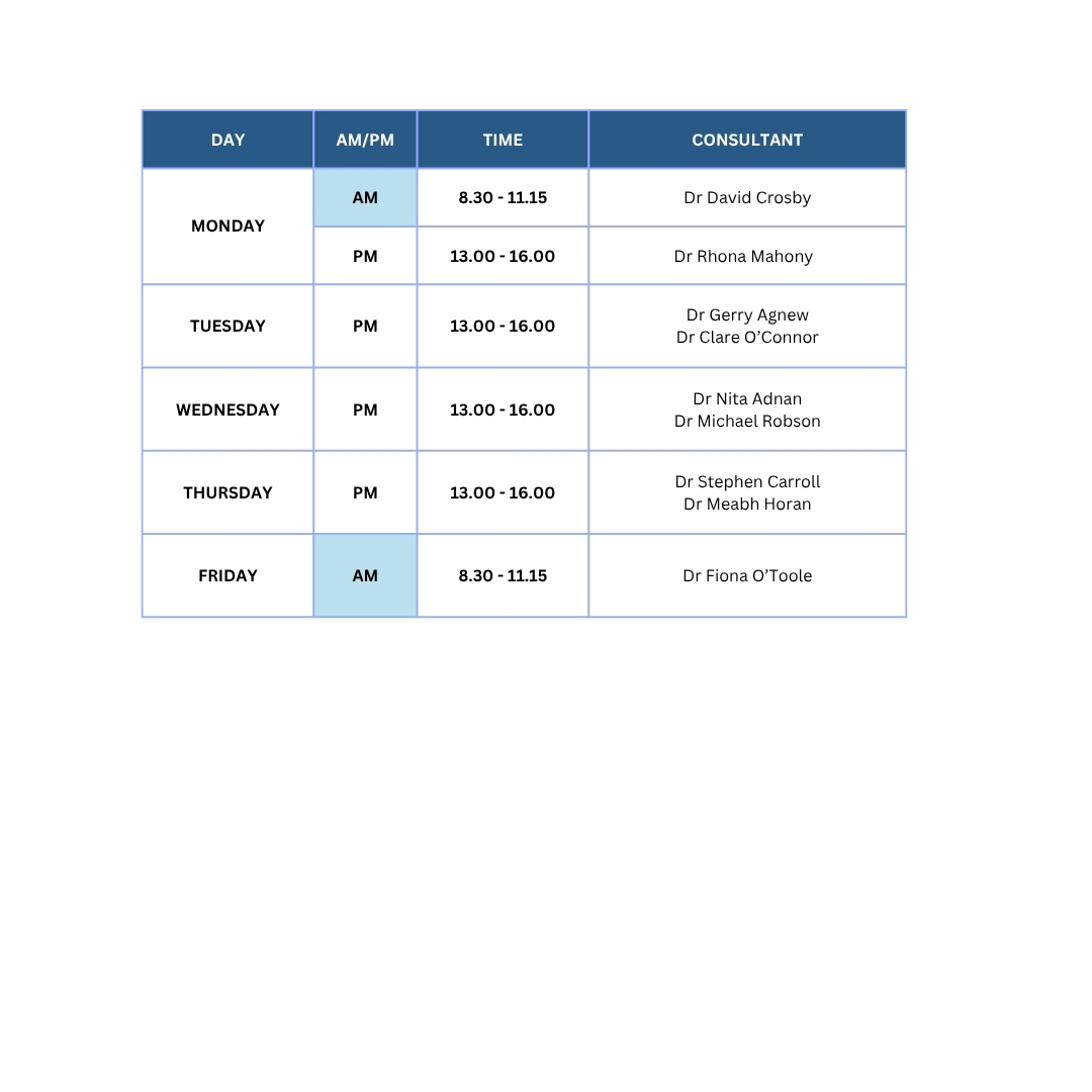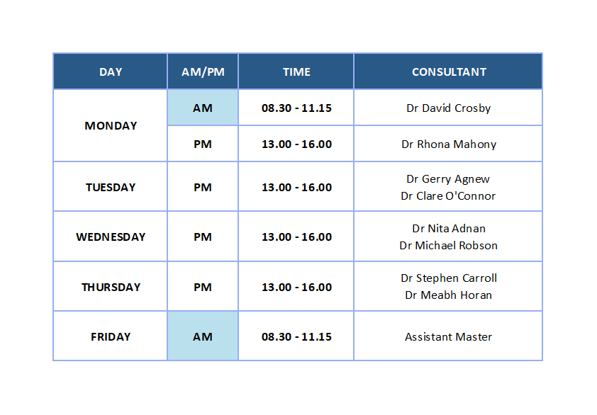 Please find below Fitzwilliam Semi-Private Clinic days, times and Consultants and Specialist Registrars attending.